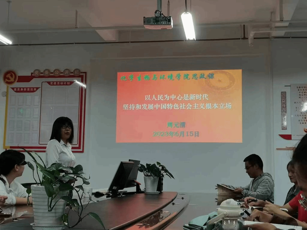 2023年6月15日化学生物与环境学院于实训大楼B609开展以“以人民为中心是新时代坚持和发展中共特色社会主义根本立场”专题思政课,由学院副院长周元清老师主讲,化学生物与环境学院学生党员参与此次学习活动。