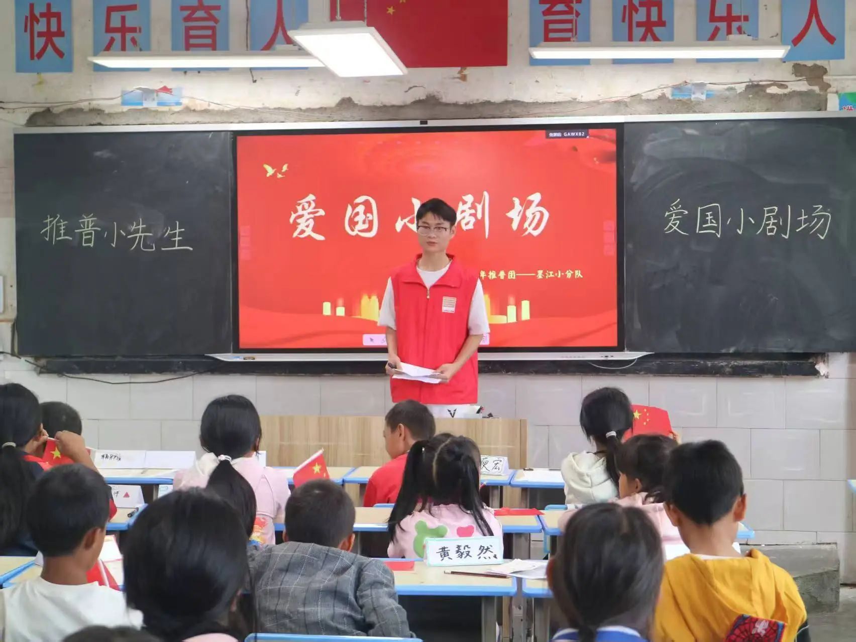 以爱国小剧场为平台,涵养赤子之心。实践团成员精心选取《那年那兔那些事》片段播放,引领孩子们沉浸观看。随后,在实践团成员指导下组织片段演绎,让革命历史与家国情怀在生动表演中自然流淌。这不仅有效推广了普通话规范,更带领孩子们重温了那段激情澎湃的峥嵘岁月。