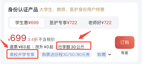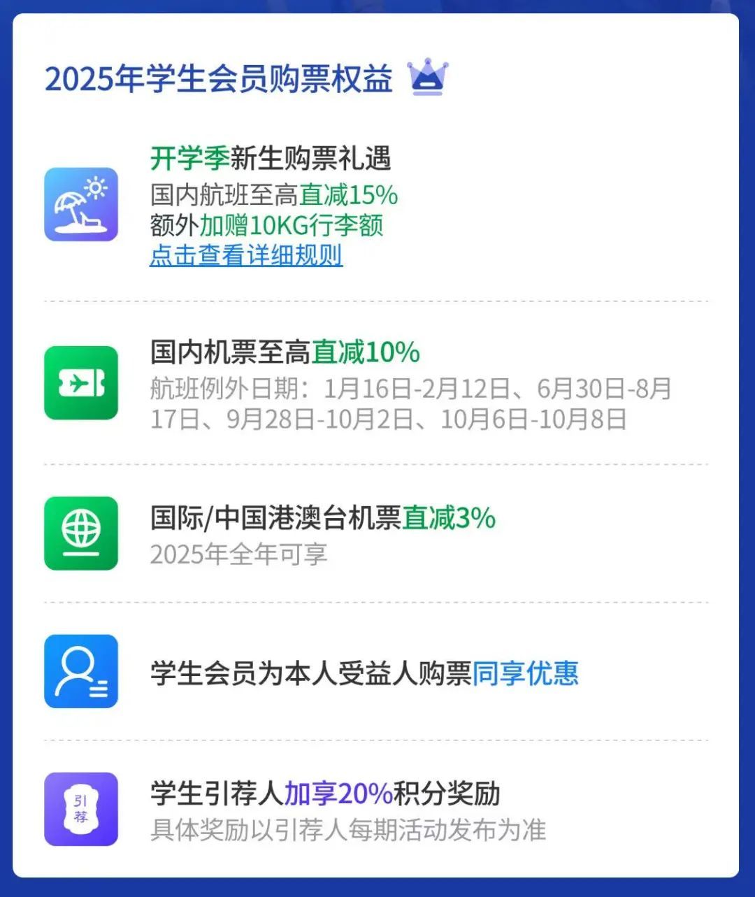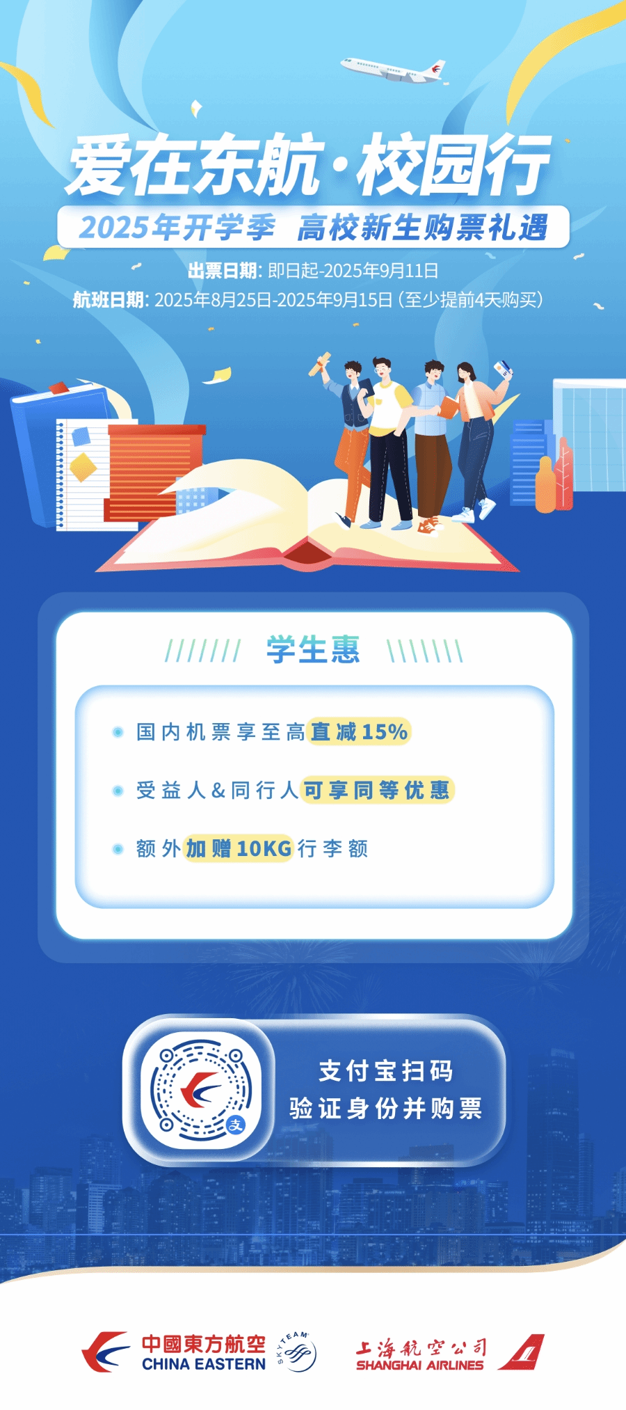 为助力2025级新生入学及在校生返校,东航“学生惠”面向中国大陆地区在校大学生、研究生(含专科、本科、硕士、博士),在适用航班票价基础上提供专属折扣,并额外赠送10KG行李额。