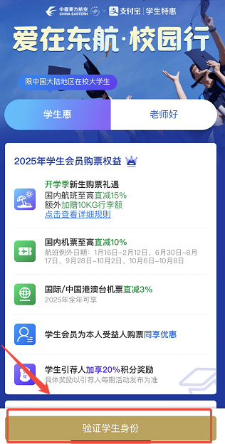 订购人:仅限通过支付宝学生验证接口完成学生身份验证,且为东航会员的学生本人购买。