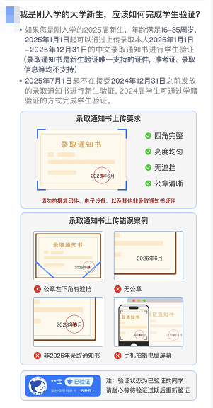 其中,2025届新生可按照支付宝学生验证规则上传本人2025年中文录取通知书完成验证后购买本产品。