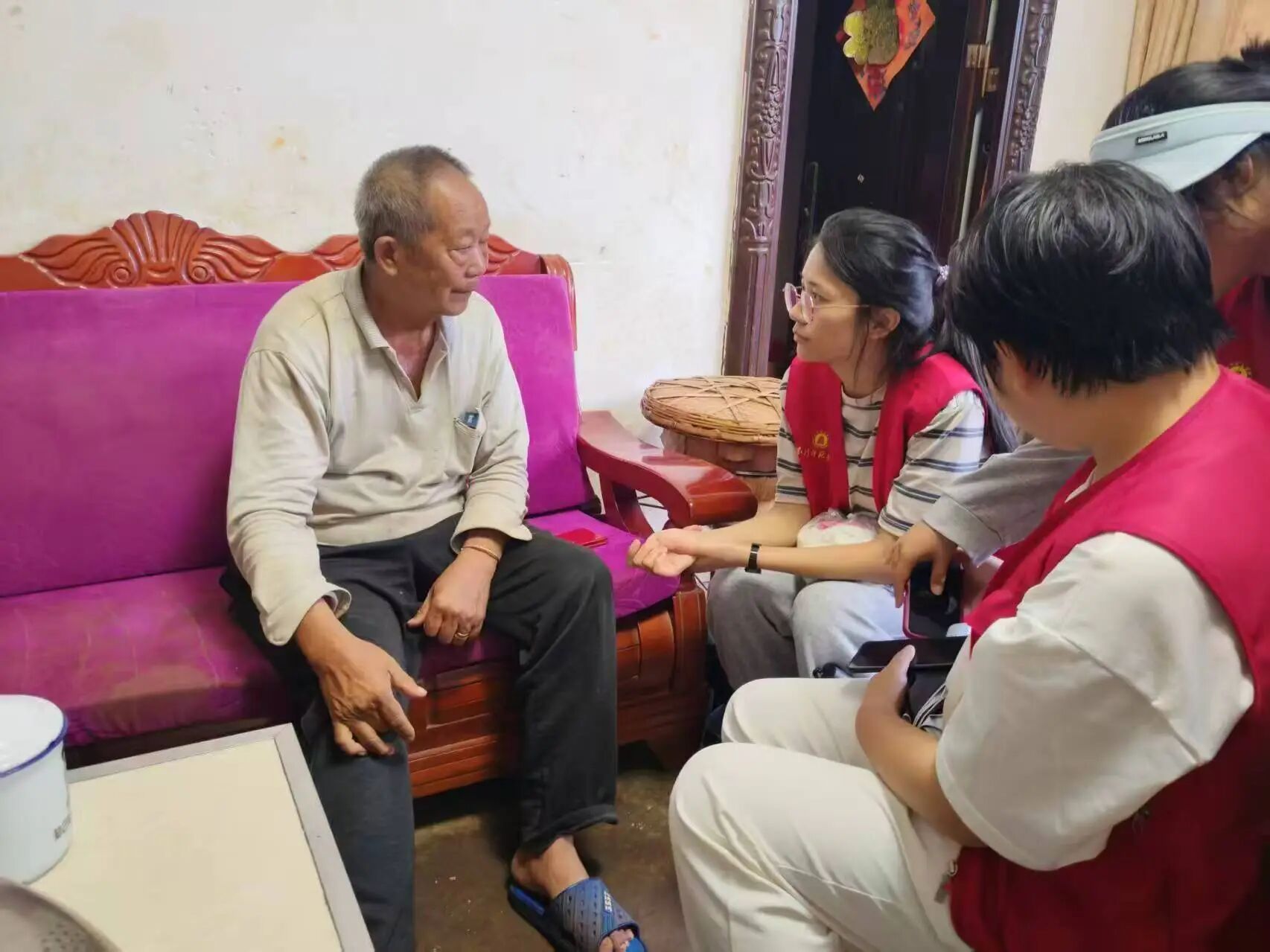 带着第一手的村情数据,团队分成若干小组深入走访。在留守老人家中,队员们一边帮忙检修家电,一边讲解防诈知识;在光荣之家院落里,实践团成员们俯身倾听革命往事,记录口述历史;在崎岖的田间地头,成员们挥汗如雨,体验着“粒粒皆辛苦”的真谛。