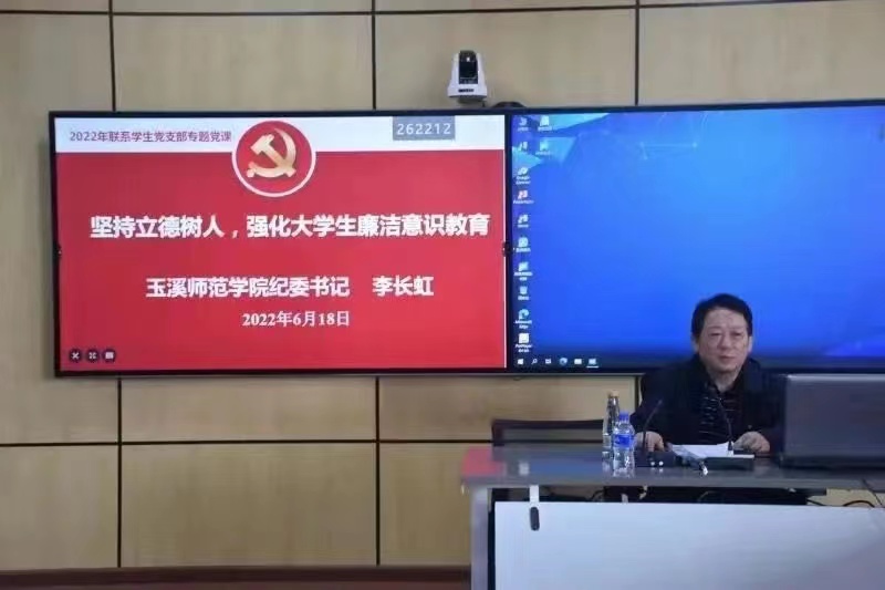 2022年6月18日9:00,由共青团玉溪师范学院委员会主办的2022年度校级“青年马克思主义者培养工程”首场讲座顺利开讲。学校纪委书记李长虹以“坚持立德树人,强化大学生廉洁意识教育”为主题,开设廉洁教育专题讲座。校团委专职团干、青马班学员以及物理与电子工程学院学生党支部党员共计64人参加。