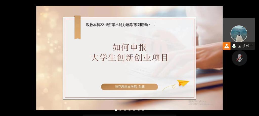 为深入推进大学生创新创业训练计划工作,促进大学生创新创业意识的培养,提高同学们参加创新创业大赛的积极性,2023年2月9日晚上20时,2022级思想政治教育1班以线上会议的形式开展了“学术能力培养”系列活动第二讲。本次活动由班主任彭建老师主讲,全班同学共同参加。