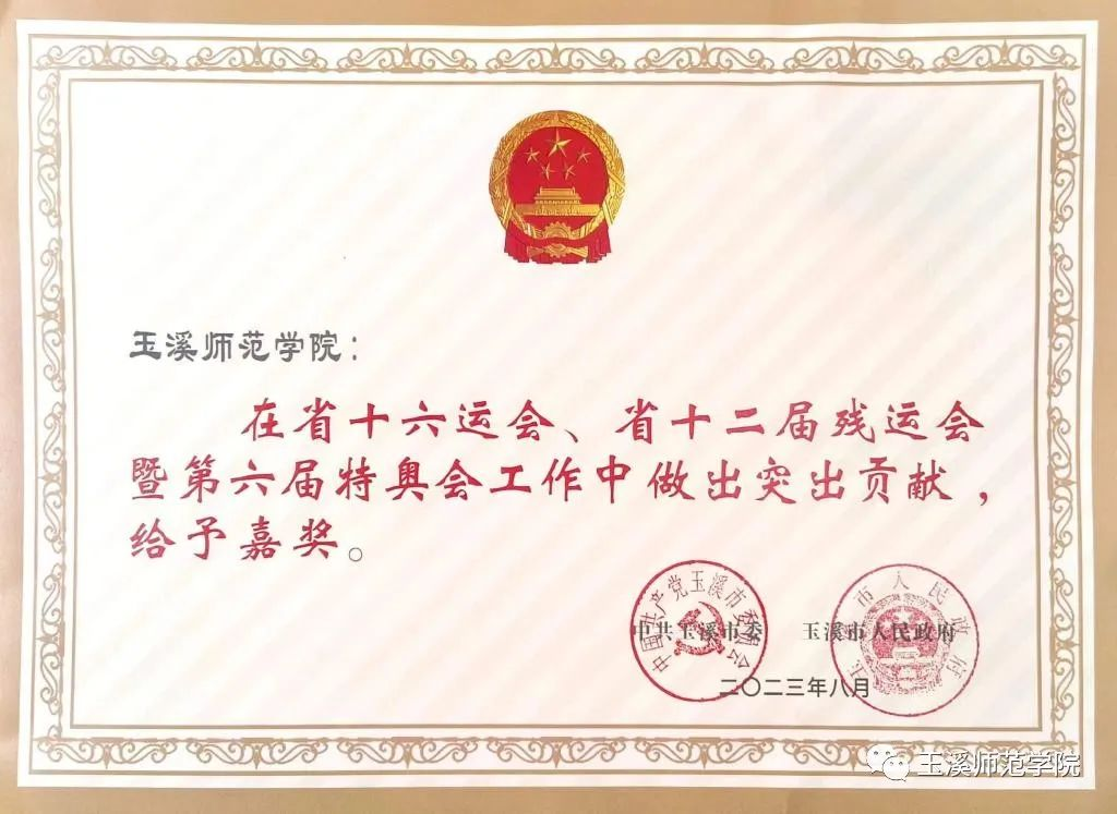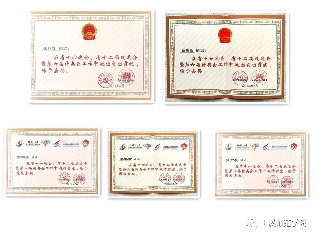 近日,玉溪市委、市政府召开云南省第十六届运动会、云南省第十二届残疾人运动会暨第六届特殊奥林匹克运动会(以下简称省运会、残运会、特奥会)玉溪市筹办工作总结大会。玉溪师范学院作为先进集体荣获嘉奖;学校团委书记徐印芳、音乐学院副院长范晓晶受到嘉奖;团委副书记余家赛、音乐学院副院长李海燕、体育学院团委书记徐广艳,2021级英语本科3班穆成红、2021级航空服务艺术与管理2班和玥辰、2020级运动康复班张轩语、王一卓以及2021级政教本科2班蒋林银受到通报表扬。