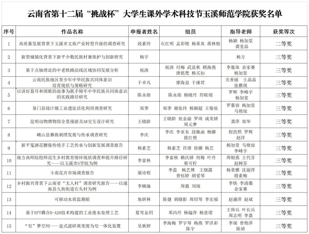 6月6日,云南省第十二届“挑战杯”大学生课外学术科技节颁奖仪式在昆明医科大学举行。经过激烈角逐,我校选送的15件作品获二等奖1项,三等奖14项。