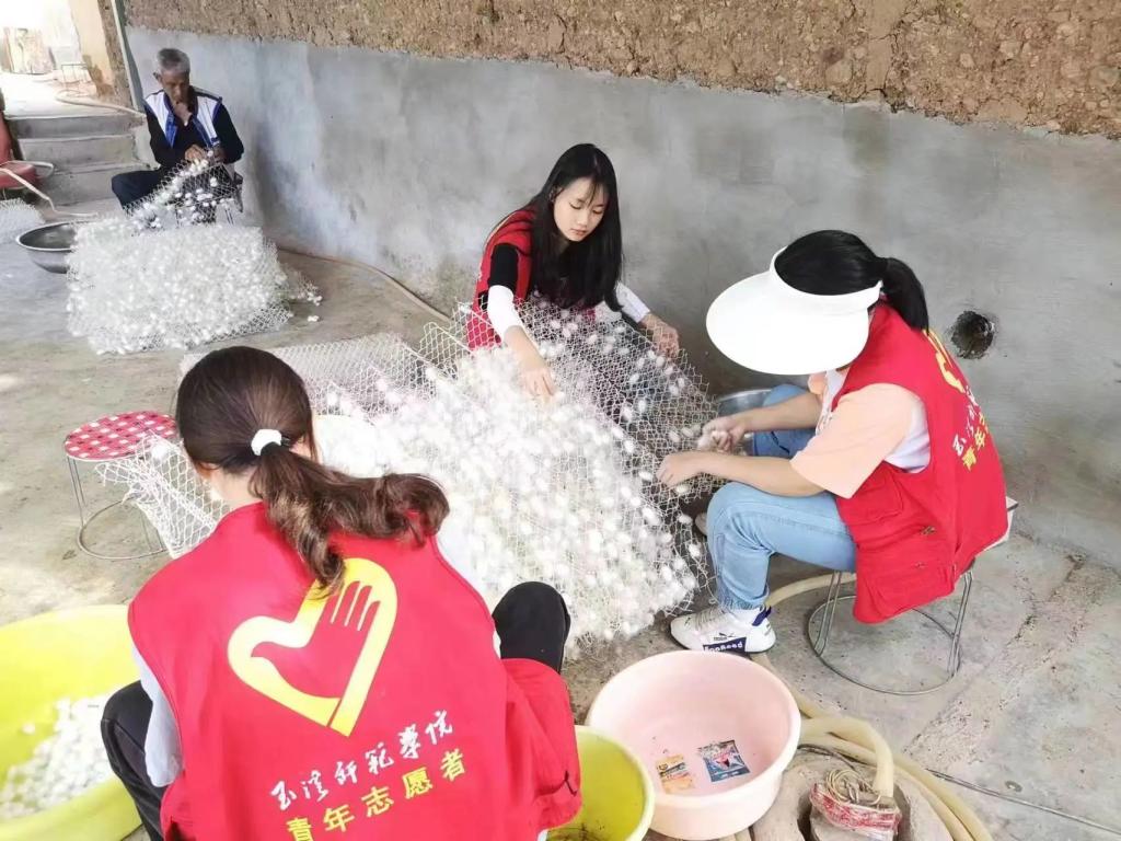 玉溪师范学院“并肩并力,同心振乡”三下乡实践团在大中村开展助农收茧的活动,与当地的养殖户一起收茧、卖茧,即感受到丰收的喜悦也为富农增收提供了动力。