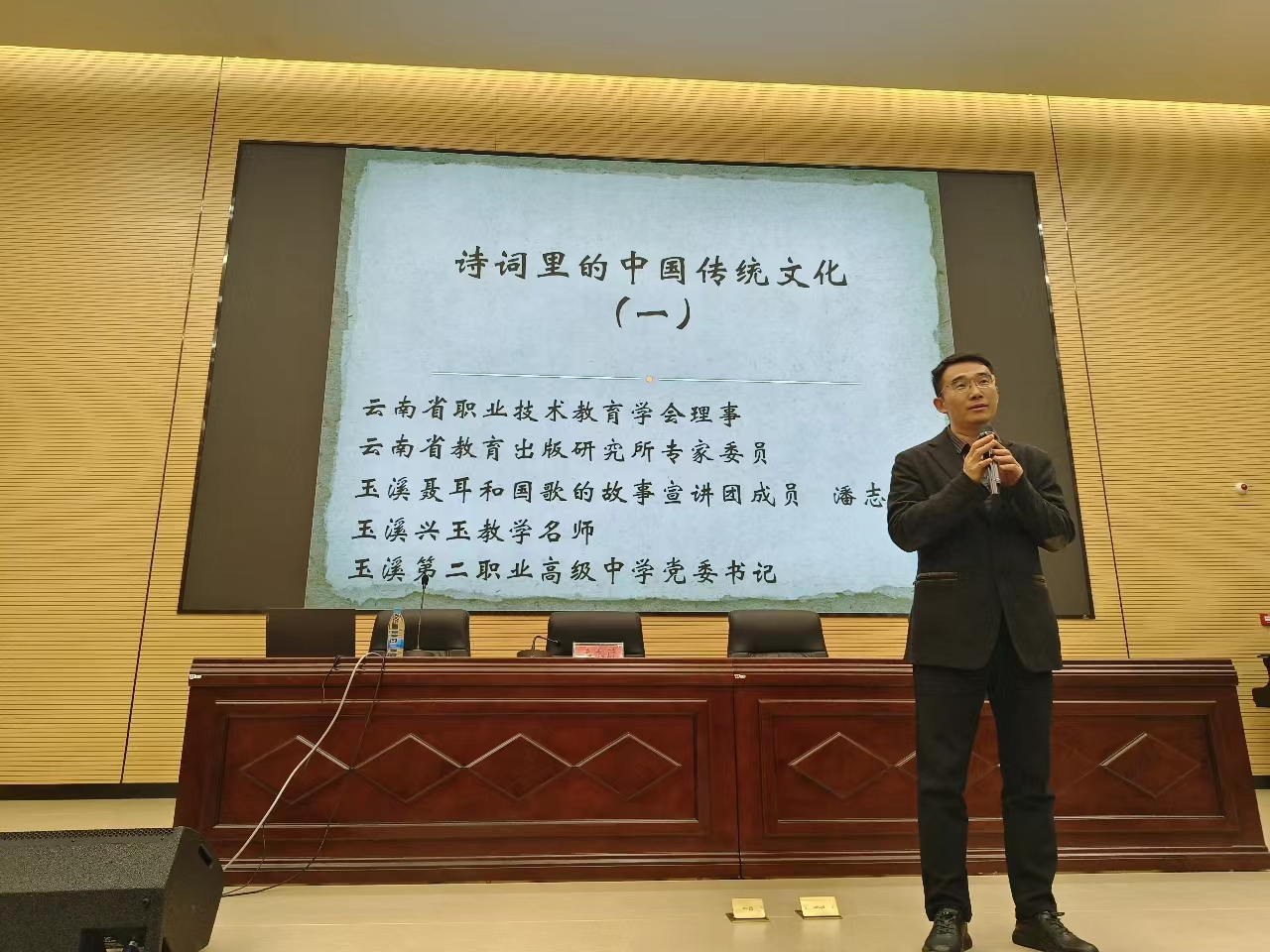 为深入学习宣传习近平新时代中国特色社会主义思想和党的二十大精神,贯彻落实习近平总书记关于青年工作的重要思想,帮助大学生树立为中华民族伟大复兴而奋斗的宏伟理想,玉溪师范学院高等职业技术学院团委于2023年10月26日19:00,在新实训大楼报告厅举行“在国歌中成长”系列讲座的第一讲,讲座主题为“诗词中的中华优秀传统文化”。此次讲座由玉溪聂耳和国歌研究会会员、玉溪兴玉教学名师、玉溪二职中党委书记潘志勇主讲,高职学院2023级新生200余人参加。