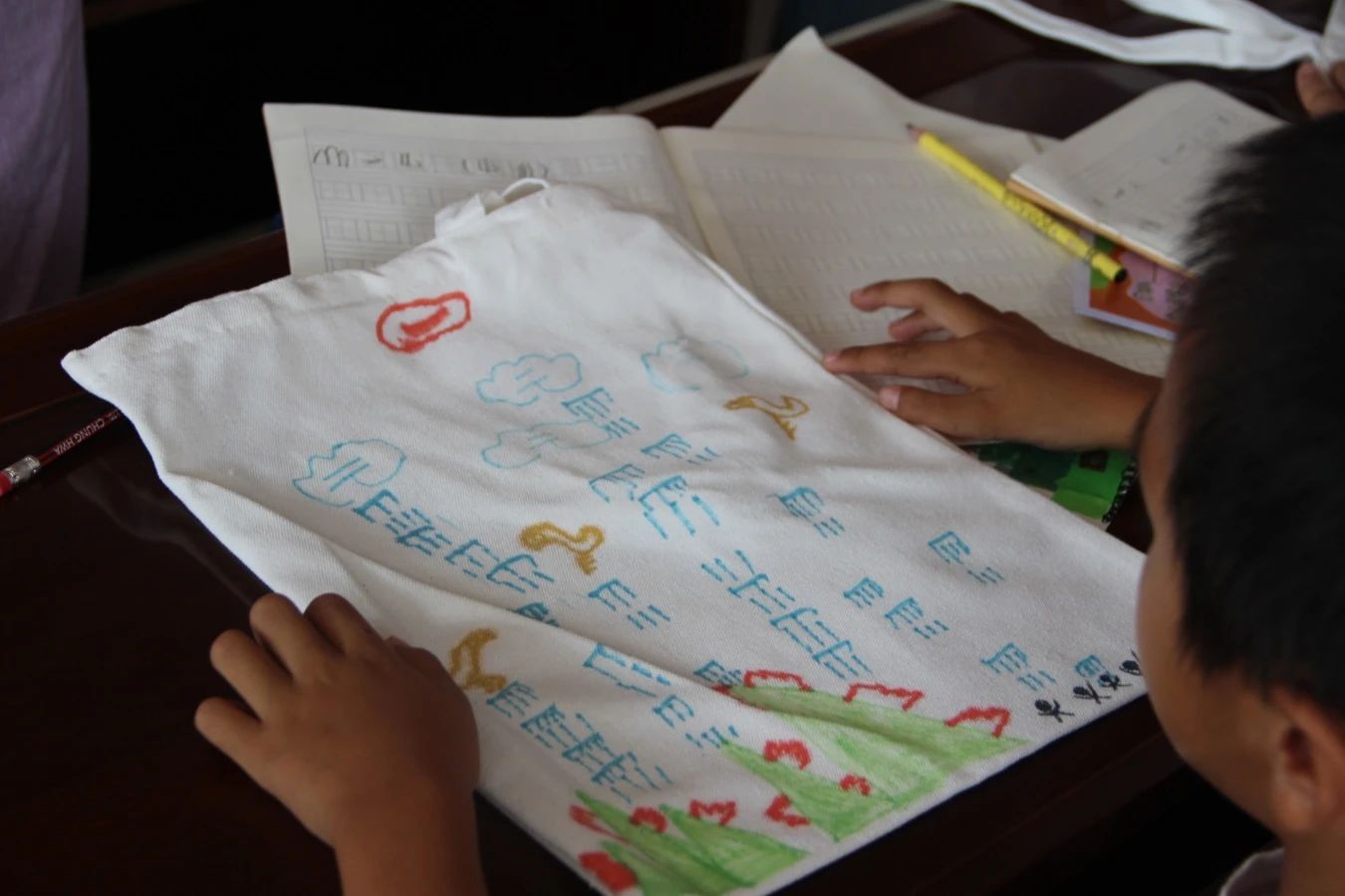 画卷传声,普语入心。除了语言文字的学习,实践队将甲骨文与汉字相结合,开展主题绘画活动,孩子们用稚嫩的画笔绘制推普海报、甲骨文推普帆布包和“二十节气”主题甲骨文长卷轴。他们用作品展示了自己对推普活动的理解,对中华文化的热爱和传承。