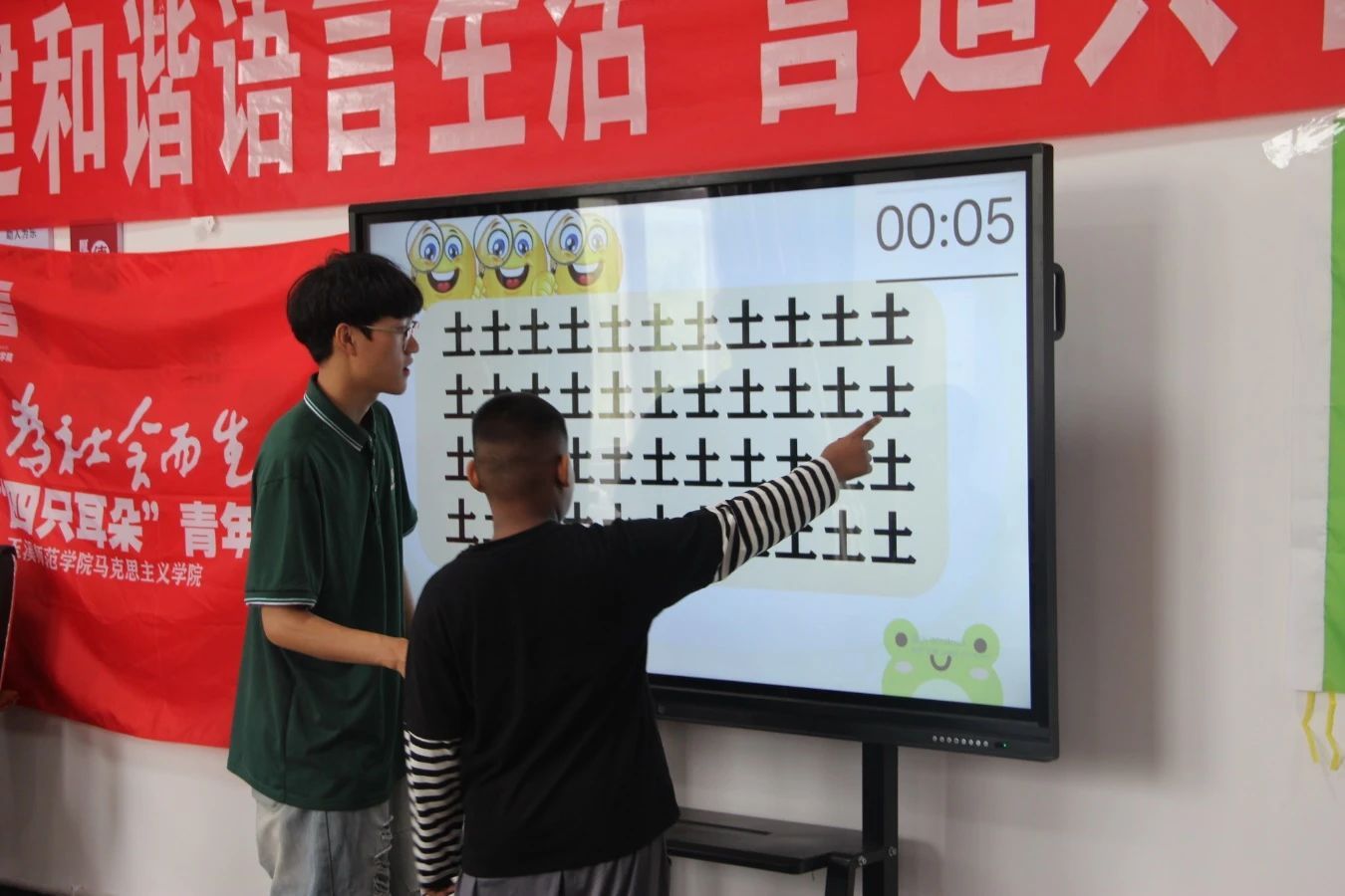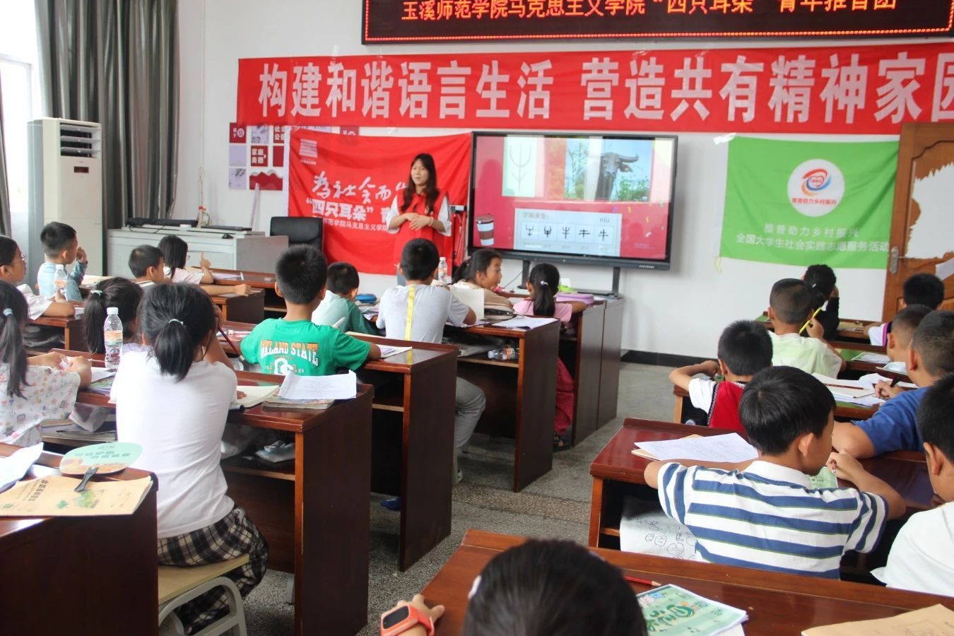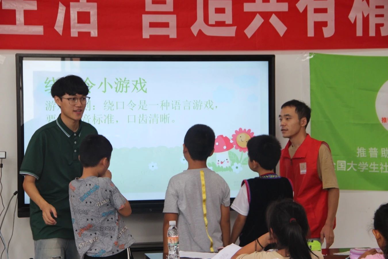 “童”学甲骨文,“童”说普通话。实践期间,推普团每日开展“10+1晨读背诵”,带领孩子们齐声诵读经典诗词,学习成语。为了让语言学习更加生动有趣,推普团开展了“文字里的中国”示范课,通过讲解甲骨文的起源和演变过程,让孩子们识汉字溯源,加深孩子们对文字发展的认识,在一笔一划间感受汉字的魅力。在此过程中,志愿者耐心纠正孩子们发音上的小错误,特别是前后鼻音与平翘舌的区分,并通过绕口令挑战、趣味辨字等小游戏进行发音练习。