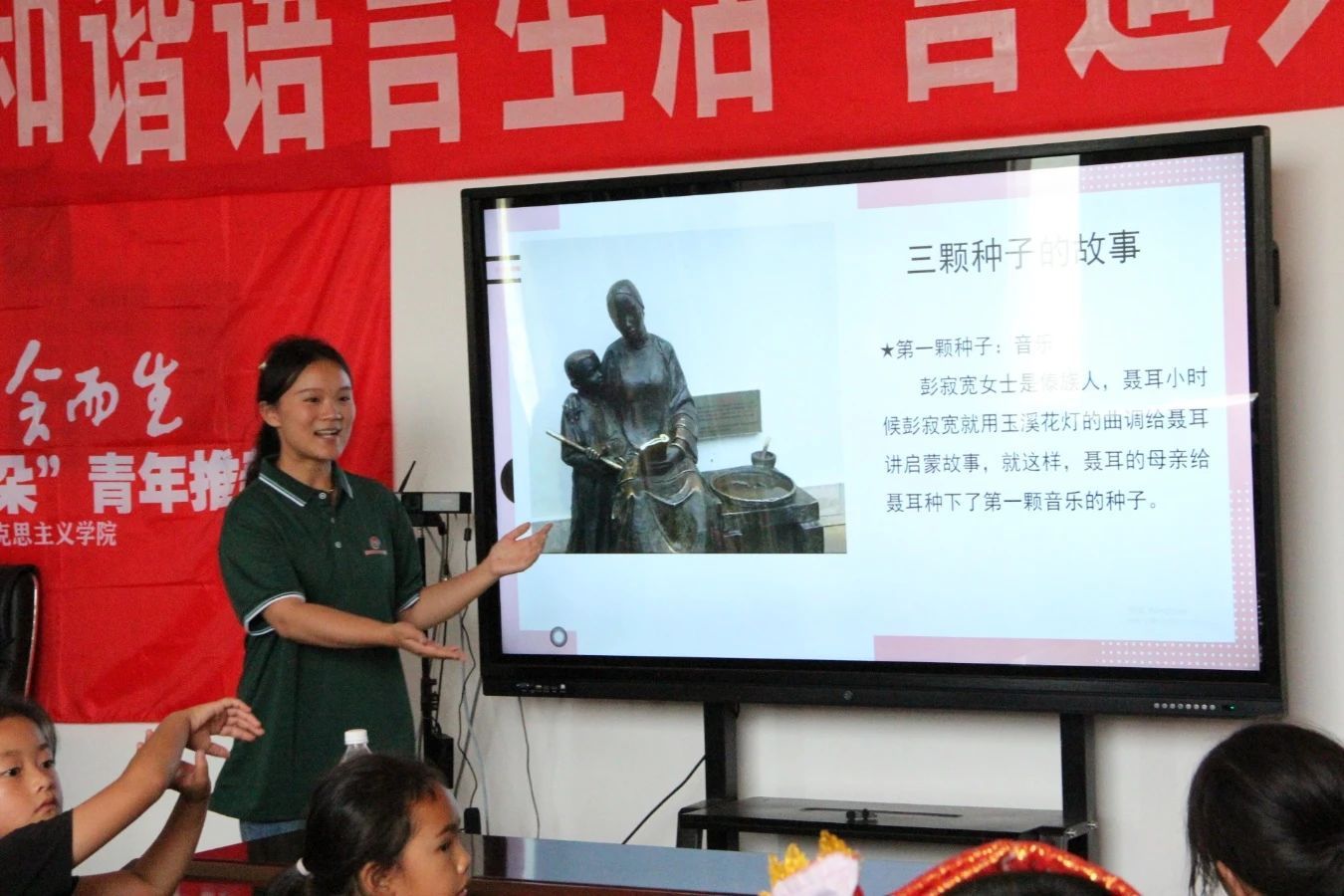 同唱一首歌,同读一封信。7月17日是聂耳诞辰112周年,推普团与孩子们在边境城镇勐董共同唱响义勇军进行曲,致敬国歌作曲者聂耳。为了更好地让聂耳精神沁润童心,让孩子们在红色文化的背景下学习普通话,推普团志愿者以玉溪聂耳纪念日周年庆的视频为引擎,为孩子们讲述“聂耳和国歌的故事”,传承其“为党奋斗、为国而歌、为民呐喊”的精神。同时,将聂耳母亲为聂耳种下的“音乐、勤奋学习、善良”三粒种子撒在孩子们的心田。此外,志愿者与孩子们同读一封信,一同学习“习近平总书记给沧源县边境村老支书们的重要回信”,鼓励孩子们从小根植“心向总书记、心向党、心向国家”的情怀。