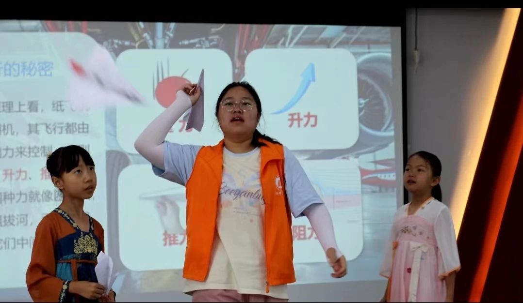 原来飞机飞行会受到重力和阻力的影响,所以飞机最终会落地,飞机飞行需要推力和升力,这样才会飞得更远。通过亲自动手与实践团成员讲解,小朋友改进自己的纸飞机。