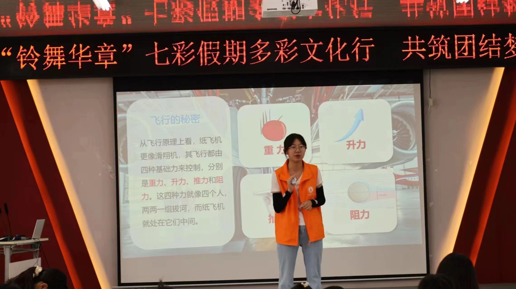 在曼哈社区,实践团成员利用七彩假期物资包里的实验工具,带领小朋友一起动手实验,一起探究飞行的奥秘,实践团成员通过让小朋友制作纸飞机,让小朋友试飞,然后讲解纸飞机的飞行原理。