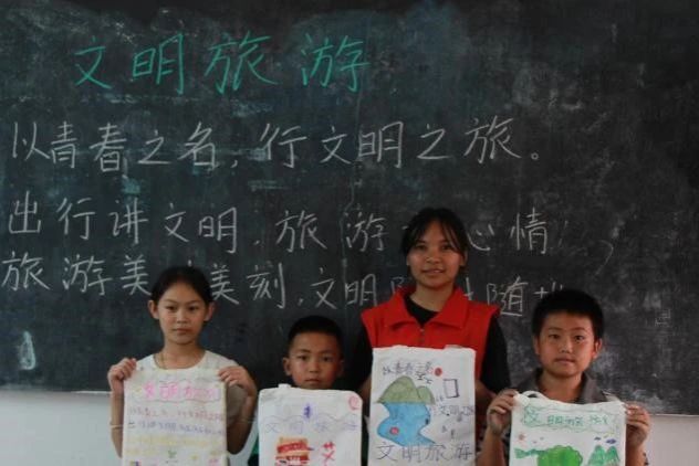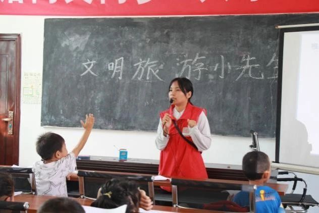 文明旅游,从心开始。当晨曦初破晓,实践团成员与孩子们围坐一起开始晨读,精美的宣传册阐述着文明旅游的要义,孩子们大声背诵,精神饱满,声音稚嫩而又充满能量,清脆而又信心十足,他们纷纷表示要成为文明旅游的传播者。在文明旅游小使者课堂上,实践团成员围绕游览文明、用餐文明、出行文明、住宿文明四个主题展开讲解。小朋友们全神贯注,积极发言。在提问环节,胡秀泽小朋友说道:“我们不能躺卧用餐以防消化不良,喷嚏时礼貌转头,餐后自觉将碗放入洗碗槽,彰显生活之礼与文明之风。”课后,实践团成员带领小朋友们绘制环保书签,将文明理念融入色彩与线条中,每一枚书签都闪耀着文明与环保的光芒。