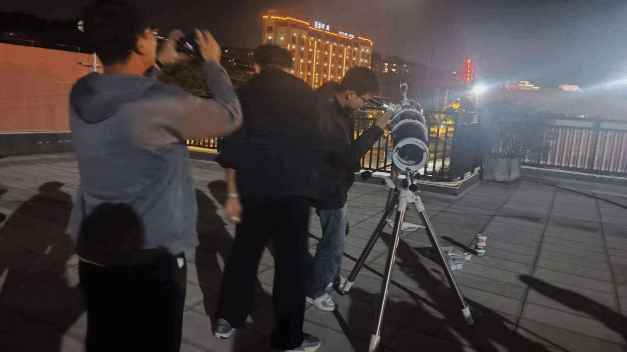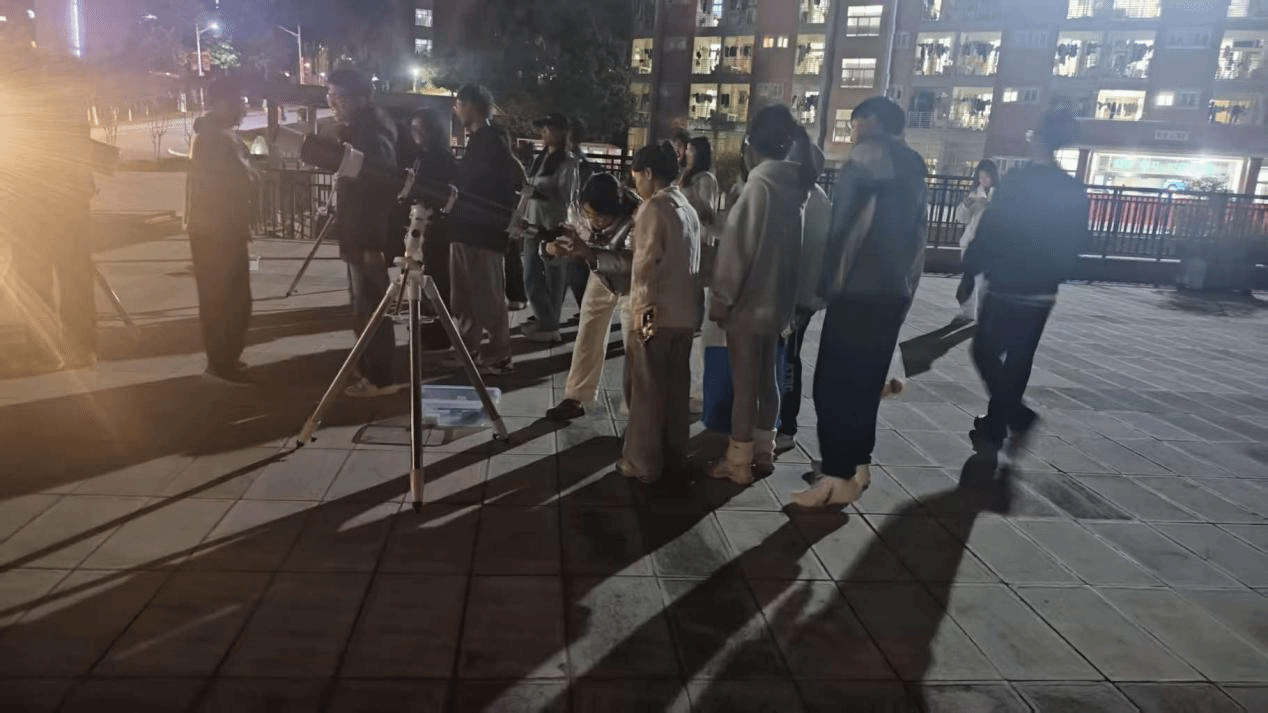 随着超级月亮逐渐升至最佳观测位置,现场的观测氛围愈发浓厚。与此同时,社团特别安排了观测仪器操作演示与讲解环节。社团技术骨干架设天文望远镜等专业设备,现场演示仪器组装调试、参数设置、目标定位、倍率调节等关键步骤;指导老师讲解观测仪器工作原理、适用场景及夜间观测月亮技巧,并介绍了如何通过望远镜捕捉月海、环形山等月球表面地貌特征的方法。